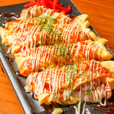 カウンター目の前で焼く当店名物【豚平焼き】!鹿児島県産黒豚を使用しております!必ず、必ず食べていただきたい逸品です!ふわふわの卵ととろけるチーズがたまらない…ご賞味あれ!