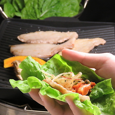サムギョプサルはキムチやナムル、サンチュの付いたセットをご用意♪楽しく包んでお召し上がりください♪