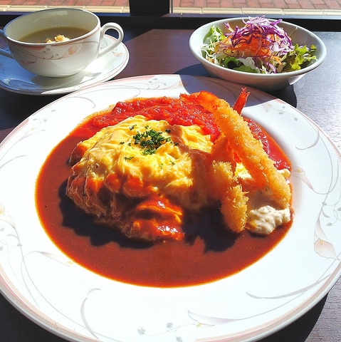 サラダ、付け合わせ食べ放題・スープ付き。デミグラスとトマトソースでいただく巻かないオムライスです。サクサクのエビフライと一緒にお召し上がりください。