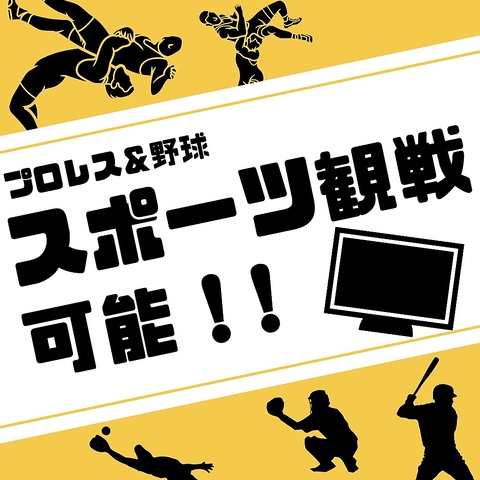 ビールと一緒に、アツい試合を楽しみませんか?当店では、プロ野球中継とプロレス番組を大型モニターで放映中!ファン同士で盛り上がるも良し、お一人様でじっくり観戦するも良し。こだわりのドリンクと逸品料理とともに、まるで会場にいるかのような臨場感をお楽しみください!
