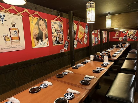 店内外にはちょうちんが飾られ、各席はのれんで仕切られており、雰囲気ある明るいつくりとなっております。テーブル席、座敷席、個室など、様々なシーンに対応可能なお席をご用意しております。