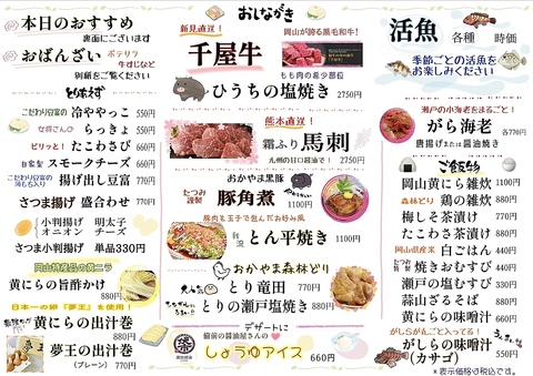 | お酒 | 焼酎充実、日本酒充実 |