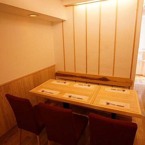 5名様~6名様のテーブル席。広々とした印象を演出しており、接待にも最適です。個室の床と壁は、日本の伝統技術である本三和土と土壁で施工。店内全てに天然素材を使用し、お客様の健康や幸せを第一に考えています。