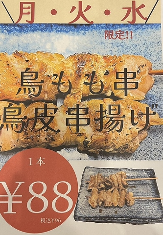 月・火・水限定で鶏もも串&鶏皮串揚げが1本96円(税込)と超お得◎是非お酒のアテに、呑みに来てくださいね♪
