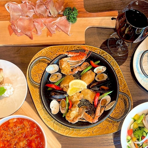香り立つ出汁でこんがり炊き上げた、パエリアが主役の夜。海の香りと彩りが一皿に詰まった定番のパエリアか、鶏肉の旨味が楽しめる王道でありながら満足感たっぷりの肉系パエリアからお選びいただけます。前菜はスペイン定番の生ハム盛り合わせと、じっくり煮込んだトリッパで。最後はほっと落ち着くデザート付き。