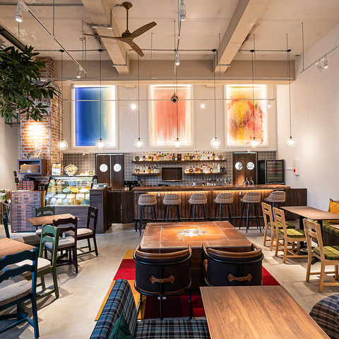 倉庫をリノベーションした開放感のあるアートな空間で、ゆったりお食事やお酒をお楽しみいただけます。Wi-Fiやコンセントがご利用いただけるお席もございますので、cafe利用のお客様も多くいらっしゃいます。
