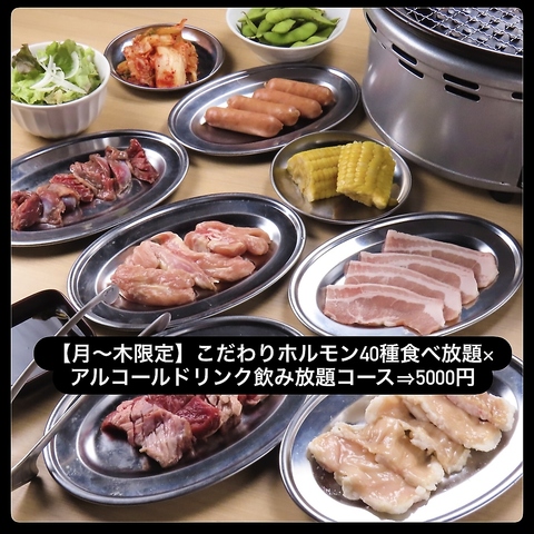 【月~木限定】こだわりホルモン40種食べ放題×アルコールドリンク飲み放題コース⇒5000円