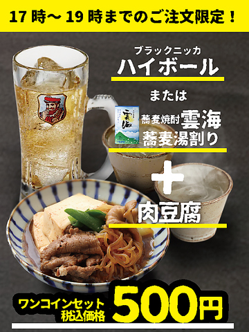 料理+選べるお酒が500円!!12月の料理は「肉豆腐」選べるお酒は「ハイボールor蕎麦焼酎雲海」です。ディナータイム19時まで、お一人様1日1回のみの限定サービスです!!