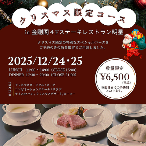 クリスマスオードブル・スープ・コンビネーションステーキ(サーロイン・赤身 計100g)・ライスorパン・クリスマスデザート・コーヒー ※写真はイメージです。前日までのご予約制となります。