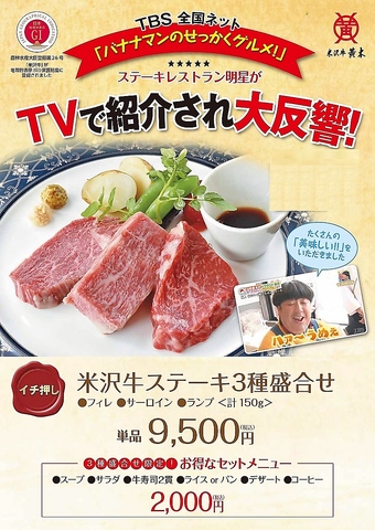 せっかくグルメで紹介された人気ナンバー1の米沢牛3種盛合せステーキ。限定のお得なセットもございます。