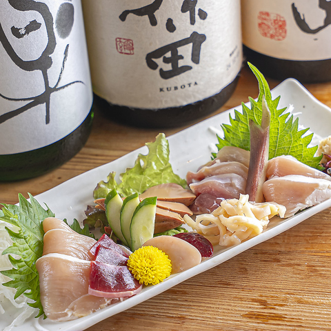 活地鶏専門店かしわの川中さんから毎日直送される、極めて新鮮な淡海地鶏だからこそ提供できる鶏のお造りは必食です!特におすすめはむね肉のお造り。癖のない歯ごたえと上品な旨味が口いっぱいに広がります。他にももも肉のお造りや、炙りむね肉のタタキなど、様々な部位のお造りをご用意しております。