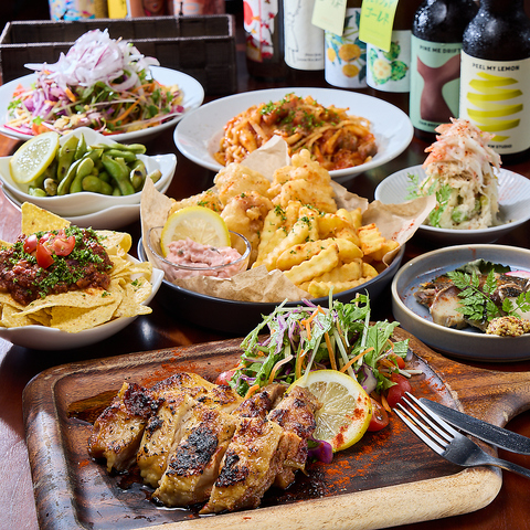 120分飲み放付きスタンダードコース。前菜から〆のパスタまでたっぷり8品、名物大阪タルタルのフィッシュ&チップスや大人気の屋台味ディアボロチキンステーキも入った大満足のお手軽コースです。各種サワーやハイボール、カクテルに酒・焼酎・ワイン、もちろん生ビール(ハートランド)も飲み放題で、税込4900円!