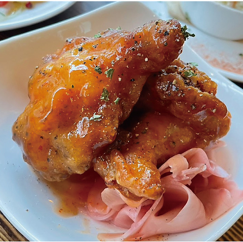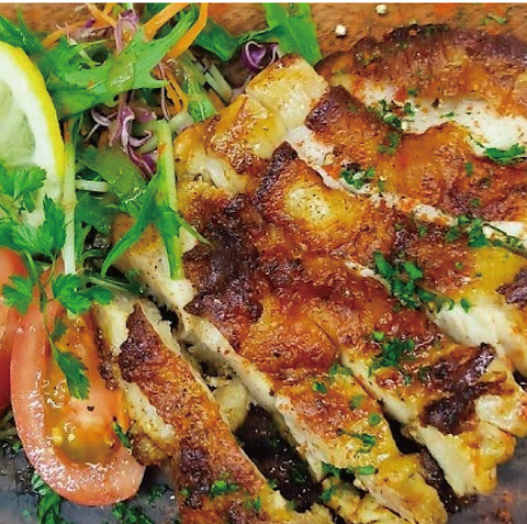 【料理にもこだわり♪】 クラフトビールだけじゃない、充実のフードメニューが自慢です! 屋台風チキンステーキです。食欲そそる一皿、ビールとの相性も抜群!自家製スモークに手ごねピッツァ、絶対お得な盛り合わせ等、可能な限り手作りの創作メニューの数々は軽いアテからお食事でも、どんなシーンにも対応可能。
