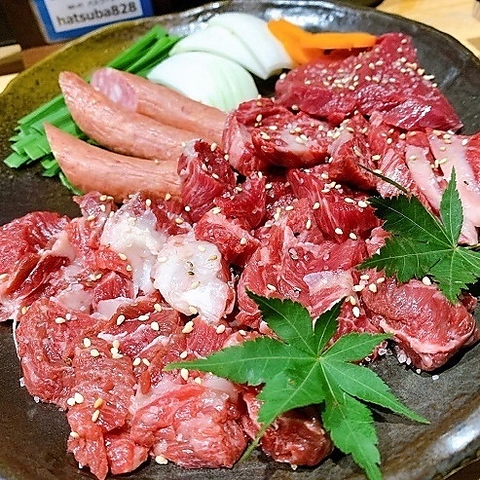 余分な脂を落としヘルシーに楽しめる馬焼肉は、女性にも大人気!濃厚な赤身肉や、さっぱりとしたハラミなど、厳選した馬肉の様々な部位を盛り合わせでご提供します。お肉は火を通しすぎないのが美味しくいただく秘訣です。ジューシーで馬肉本来の旨味をしっかりと感じられます。4~5人前8780円(税込)