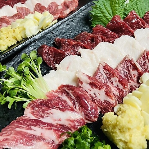 鮮度に自信があるからこそご提供できる極上馬刺し。あかみ、特上バラ、こうね(たてがみ)を盛り合わせた贅沢な一皿です。薬味の生姜やニンニク、ネギと一緒に様々な味わいをお楽しみください。上質な脂の甘みと赤身の深い旨味をご堪能いただけます。1~2人前(各4枚)2880円(税込)