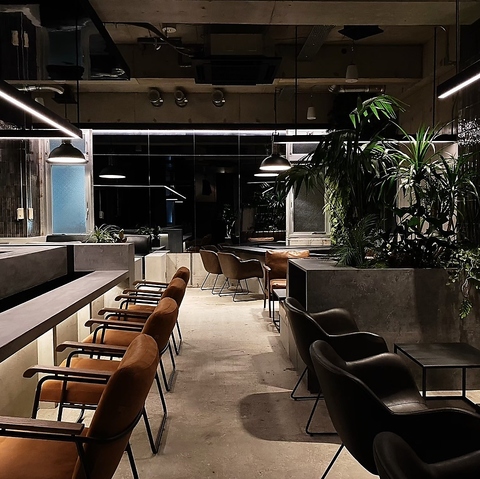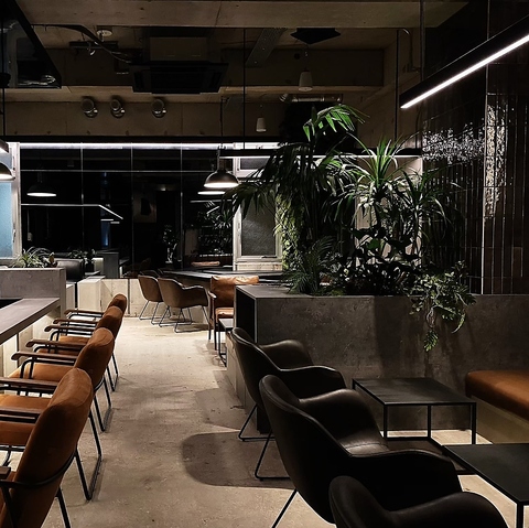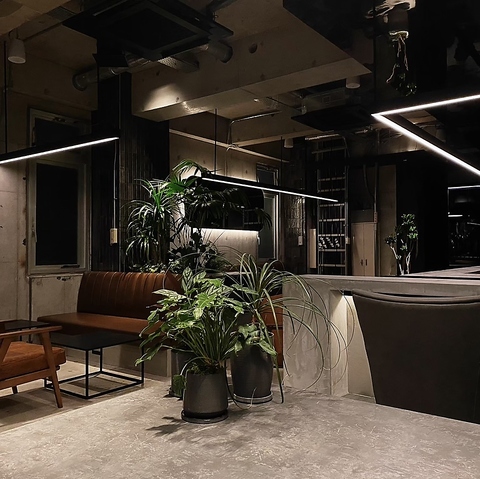 非日常を演出する落ち着いた照明と、ゆったりと配置された上質なソファ席は、都会の喧騒を忘れさせる隠れ家のような空間。細部までこだわったインテリアと柔らかなグリーンが調和し、心安らぐひとときをご提供いたします。