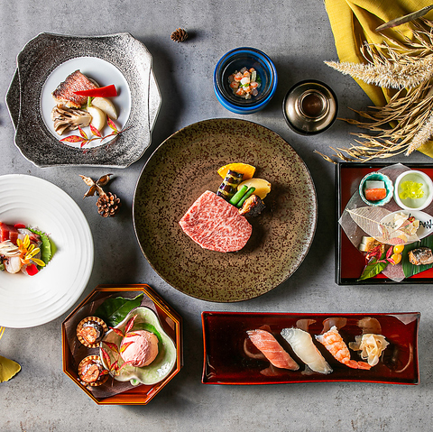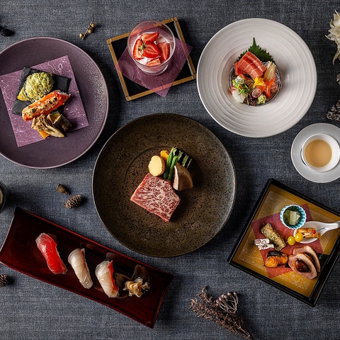東京に集まる各地の食材、その食材に合う調味料を生かした創作和食を提供しております。ディナータイムのコースは、牛サーロインと和牛、米沢牛から選べるスペシャリテをご用意。旬の食材をふんだんに使い、日本料理の「和」の技法を用いた味をベースにしながらも、国籍にこだわらないフュージョン料理を存分にお楽しみください。