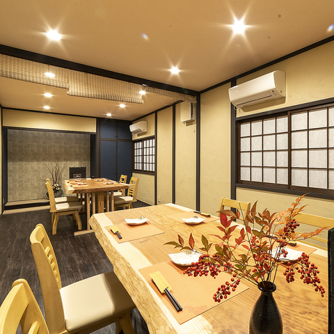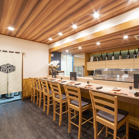 木の温もり溢れるカウンター席は広々7席ご用意。握る姿や調理の様子、職人技を目の前で楽しみたい方は、臨場感あふれるカウンター席がオススメです。デートや大切な方との記念日や、おひとり様でのご利用の際にもお気軽にご予約ください。新鮮な魚と食材を使用したお料理をご用意して、ご来店を心よりお待ちしております。