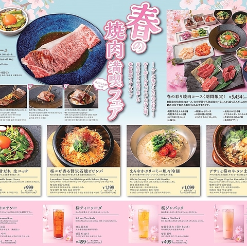 桜エビ香る石焼ビビンバや新鮮ハツの生ユッケ、アサリと筍の牛タン土鍋ごはんなど、春ならではの特別メニューをご用意!桜レモンサワーや桜ジンバックなど、この季節限定のドリンクも登場。焼肉とともに、春の彩りと香りを楽しめるラインナップです。ご家族やご友人とのお食事、春の集まりにもおすすめ♪