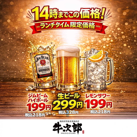 14時までランチタイム限定価格でご提供!◆生ビール 299円(税込328円)◆ジムビームハイボール 199円(税込218円)◆レモンサワー 199円(税込218円)