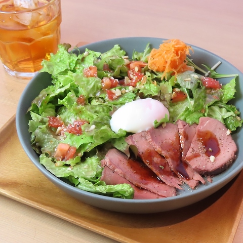 カフェメニューは、ロコモコ・パスタ・サラダプレート・選べるカレー他。たっぷりサラダもヘルシーで◎