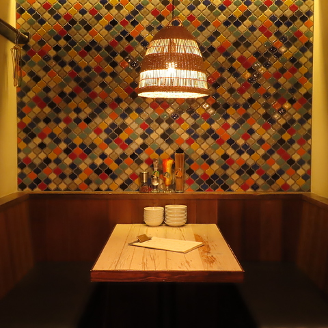 【半個室】【カウンター】【テーブル席】各種ご用意ございます。半個室、ゆったりとお寛ぎいただけるテーブル席、立ち飲みも大歓迎のカウンター席など様々なシーンで◎!カラフルなタイルをあしらった可愛い雰囲気やオリジナル雑貨も多数、遊びごごろをくすぐる店内。女子会にもぴったりなこだわり空間をお届けいたします。