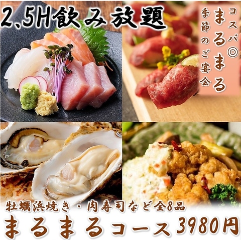 『まるまるコース』牡蠣の浜焼きや産直鮮魚盛り含9品 3時間飲み放題付 4480円⇒3980円