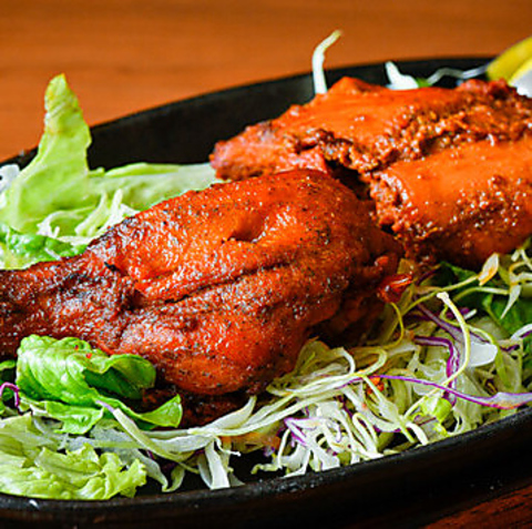 インド料理の定番「タンドリーチキン」は、特製スパイスとヨーグルトに漬け込んだ骨付きチキンを、高温の石窯でじっくり焼き上げました。外は香ばしく、中は驚くほどジューシー!スパイシーな香りが食欲をそそる、当店の人気メニューです☆