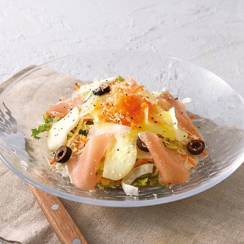 生ハムの塩気とモッツァレラのやさしいコクが絶妙にマッチ。シンプルながらも贅沢な味わいのサラダです。