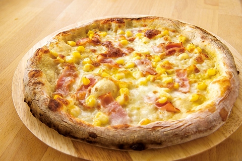クリームソースをベースにベーコンとコーンをトッピングし、仕上げにマヨネーズをかけたピザです。