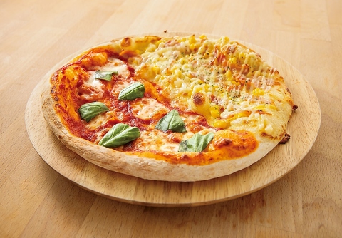 トマトとチーズの王道マルゲリータと甘みが広がるベーコンコーンマヨピザの2種類楽しめるピザです。