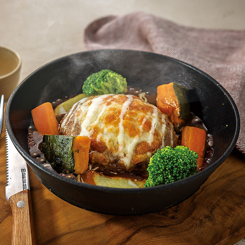 黒毛和牛100%のハンバーグに、コク深いデミグラスソースに芳醇な香りの赤ワインソースを合わせ、濃厚なチーズソースをとろ~りかけました。ホクホクのカボチャや人参といった冬野菜とともに、五徳で最後まで熱々のままお召し上がりいただけます。寒い季節にぴったりの、心も体も温まる一皿です。