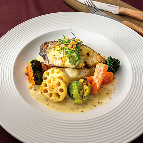 ふっくらと香ばしく焼き上げたブリに、ガーリックバターの風味と、きのこの旨味が凝縮されたデュクセルクリームソースをたっぷりとかけた、冬限定の贅沢な一皿。ブイヨンとミルクでじっくり炊いた大根に、冬を感じる蓮根やかぼちゃ、人参、芽キャベツ、ブロッコリーなどのお野菜を添えて、素材の持ち味を存分に引き出しました。九条ネギの風味とフライドガーリックの香ばしさがアクセントです。