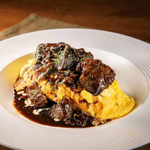 ふわとろ卵が自慢のオムライスに、濃厚なビーフシチューを贅沢にかけて仕上げました。芳醇な赤ワインの香りと深いコクをまとったソースが、ライスと卵に絡み合い、口の中でほろほろとほどける牛ほほ肉が至福のひとときを演出します。肉の旨みと卵のやさしさが奏でる贅沢なハーモニーを、心ゆくまでご堪能ください。