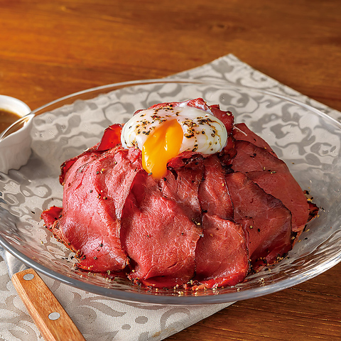 重なり合うローストビーフが生み出す圧巻の肉の山。その中には彩り豊かなサラダを忍ばせ、仕上げにとろける温泉卵を贅沢に添えました。ワサビの香り広がるドレッシングがアクセントです。肉と野菜、卵が奏でる至極のハーモニーを、特別なひとときに。