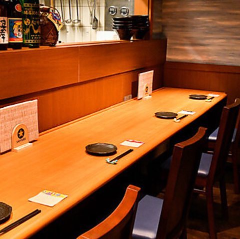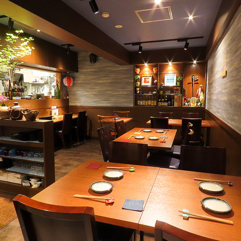 木の温もりに包まれた隠れ家的な雰囲気の店内では、広々としたカウンター席をご用意してます。人数やシーンを問わず、肩の力を抜いてリラックスしてお楽しみいただけます。また最大15名様までの貸切も可能、特別な集まりやお祝い事にも最適です。お客様一人ひとりに寄り添いながら居心地の良さを大切にしています。