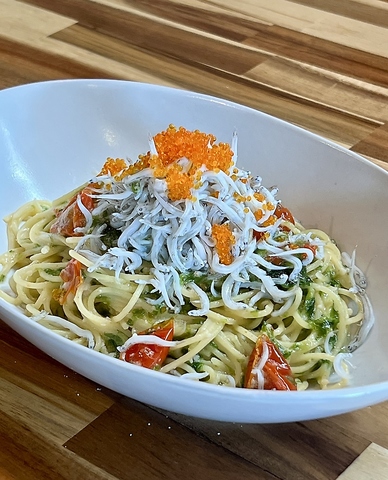 浜名湖産の生のりを使ったオリジナル和風ソースをたっぷりの釜揚げしらすととびっこが色鮮やかなオリジナル和風パスタです!