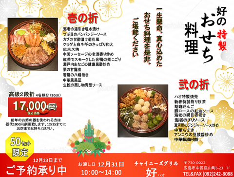 「チャイニーズグリル好」の特製おせちは、海老の湯引きや中華くらげ、八寸焼売など、彩り豊かな中華料理を贅沢に詰め合わせた高級二段折(4名様分・税込17,000円)です。50セット限定でご予約は12月23日まで、受け渡しは12月31日10時~14時となっております。