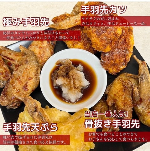 当店がおすすめする新しい名古屋名物をご紹介!【骨抜き手羽先】その名の通り美味しくて骨抜きになってしまうかも…!? 【手羽先天ぷら】手羽先をさっぱり大根おろしとポン酢で♪ 【手羽先勝】カツと勝をかけた、ゲン担ぎなどに持ってこいのメニュー!