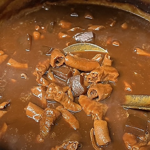 豚ホルモンとこんにゃくを赤味噌で煮込んでます