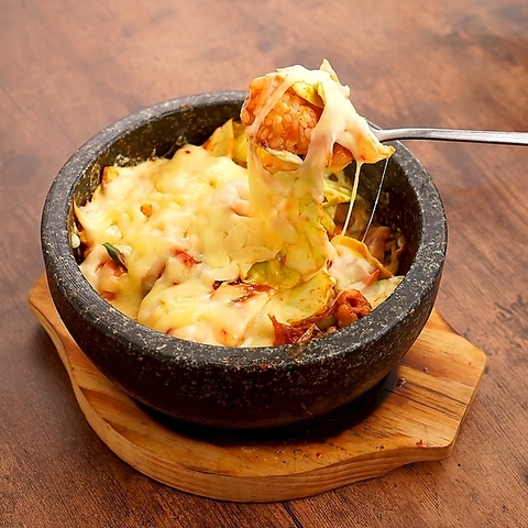 アツアツチーズと甘辛い鶏肉、サツマイモ、トッポキと野菜の最強コラボとろ~りチーズに絡めて召し上がれます。おじやセットお勧め!!