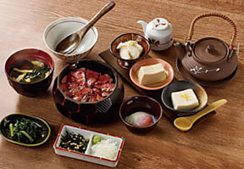 和牛ひつまぶし、出汁、半熟卵、薬味、胡麻豆富、ゆず豆富、おぼろ豆富、みそ汁、漬物
