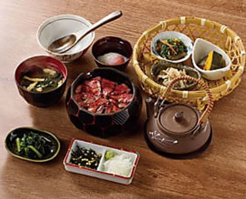 和牛ひつまぶし、出汁、半熟卵、薬味、とろろ、みそ汁、漬物