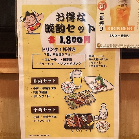 会社帰りにもサクッと食べて飲める晩酌セット。セットは2種類ございます。◆幕内セット(小鉢/串焼き3本/刺身3種盛/お好きなドリンク1杯(生ビール or 日本酒 or チューハイ or ソフトドリンク)◆十両セット(小鉢/串焼き7本/お好きなドリンク1杯(生ビール or 日本酒 or チューハイ or ソフトドリンク)※お一人様いずれか1セットとさせて頂きます。
