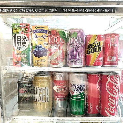 定番のコカコーラをはじめ、サイダー、数量限定ジュース、野菜ジュース、果汁100%ジュース、ジンジャエール、ウィルキンソン、エナジードリンク、お~いお茶、十六茶、午後ティー、レモン水が時間内飲み放題。