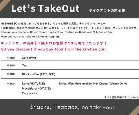 レジにて「キッチンカーの商品を注文しました」とご報告をいただくと10種類以上のコールドドリンクをはじめ高級コーヒーやティー類など全品50円引きでご提供いたします。是非ご利用くださいませ♪