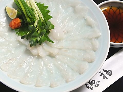 活きたフグを注文時に裁くので鮮度抜群の歯ごたえ!自家製だれ・薬味をたっぷりつけて召し上がり下さい♪