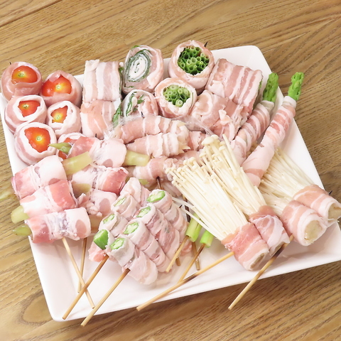 女性をはじめ、ヘルシーに楽しめる一品として人気の『豚バラ野菜巻き』もぜひご賞味ください!大葉・よかねぎ・トマト・えのき・みょうが・岩下の新生姜のほか、季節ごとの旬の野菜をジューシーな豚バラ巻きで包み焼きに。野菜の甘みと豚バラの塩味のバランスがよく、お酒がとまらなくなる味♪