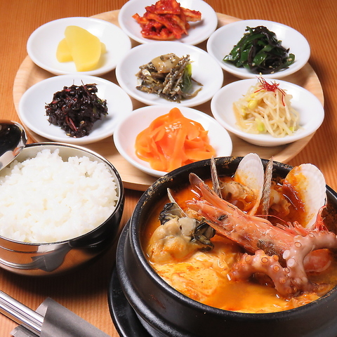 人気のスンドゥブに海鮮をたっぷりトッピングしました。