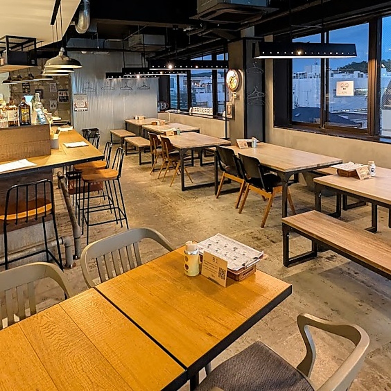 インダストリアルな落ち着いた店内 店内は広く大人数のパーティーなども対応可能です。